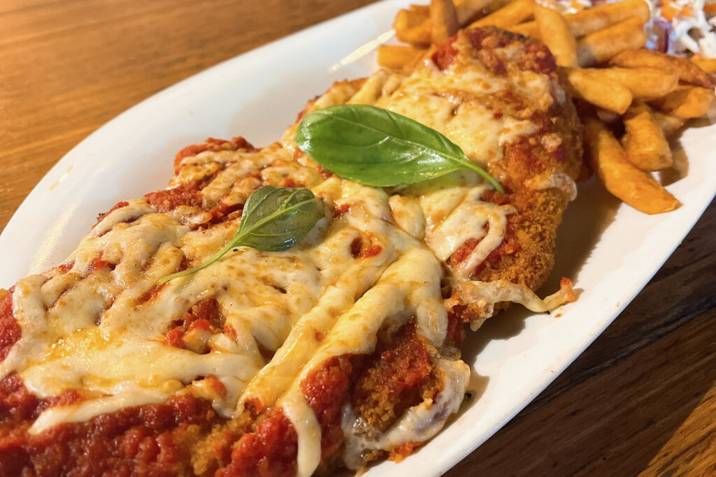 チキンの薄切りフライにトマトソースとチーズがたっぷりかかっていて、とにかくサイズが巨大。